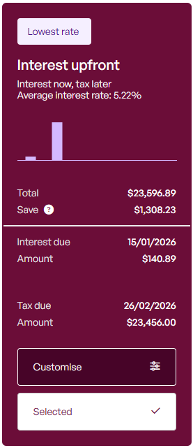 The finance calculator by default utilises the Interest upfront option within the Tax Traders platform. This will always be the lowest rate tax purchase within Tax Traders.