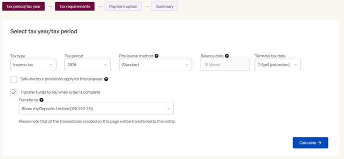 💡TIP: if wanting to send tax to an associated taxpayer, check Transfer to IRD when order is complete to choose the correct taxpayer for the purchase to be sent to.