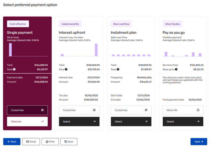 Select an interest payment date and using the customise option you can amend the core tax payment to weekly, fortnightly or monthly instalments, or set a single payment maturity date up to 75 days after your taxpayers terminal tax date.