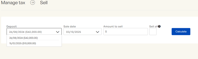 From within the sell screen, choose the deposit/s that you want to sell, along with the sell date and amount to sell.