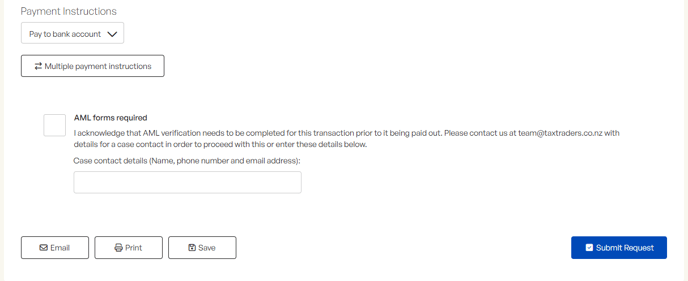 Note: an AML check is required for any refund over $1,000. If this is required, you will be prompted to provide details as per the screenshot below.