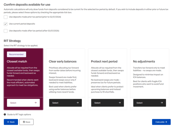 Selecting the correct RIT logic depends on your client’s situation. RIT logic controls how funds are applied when calculating Residual Income Tax. Choosing the appropriate logic helps ensure tax obligations are met efficiently and aligns with client preferences around interest exposure, timing, and ICA impact.